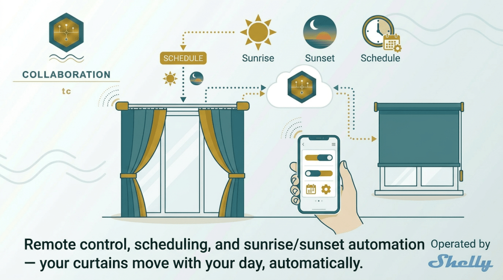 Control curtains from your phone, a wall switch, or automatically by time and sunlight.